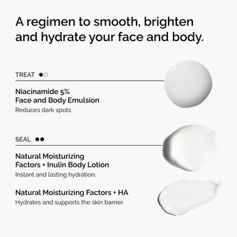 Niacinamide 5% Face and Body Emulsion: a multi-functional, full-size formula that helps fade the look of dark spots on the face and body, for a more even-looking skin tone. Tested on all skin tones, it targets the appearance of dark spots across the face, neck, chest and arms – key areas prone to uneven skin tone—for a more uniform tone across face and body.