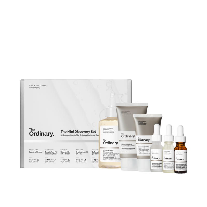 The Mini Discovery Set is the ideal place to begin with The Ordinary. It features miniature sizes of some of our most popular formulations for a complete skincare regimen. The set includes a cleanser, exfoliating toner, face serums, an eye serum and a moisturizer, which can be used together in a daily regimen.
